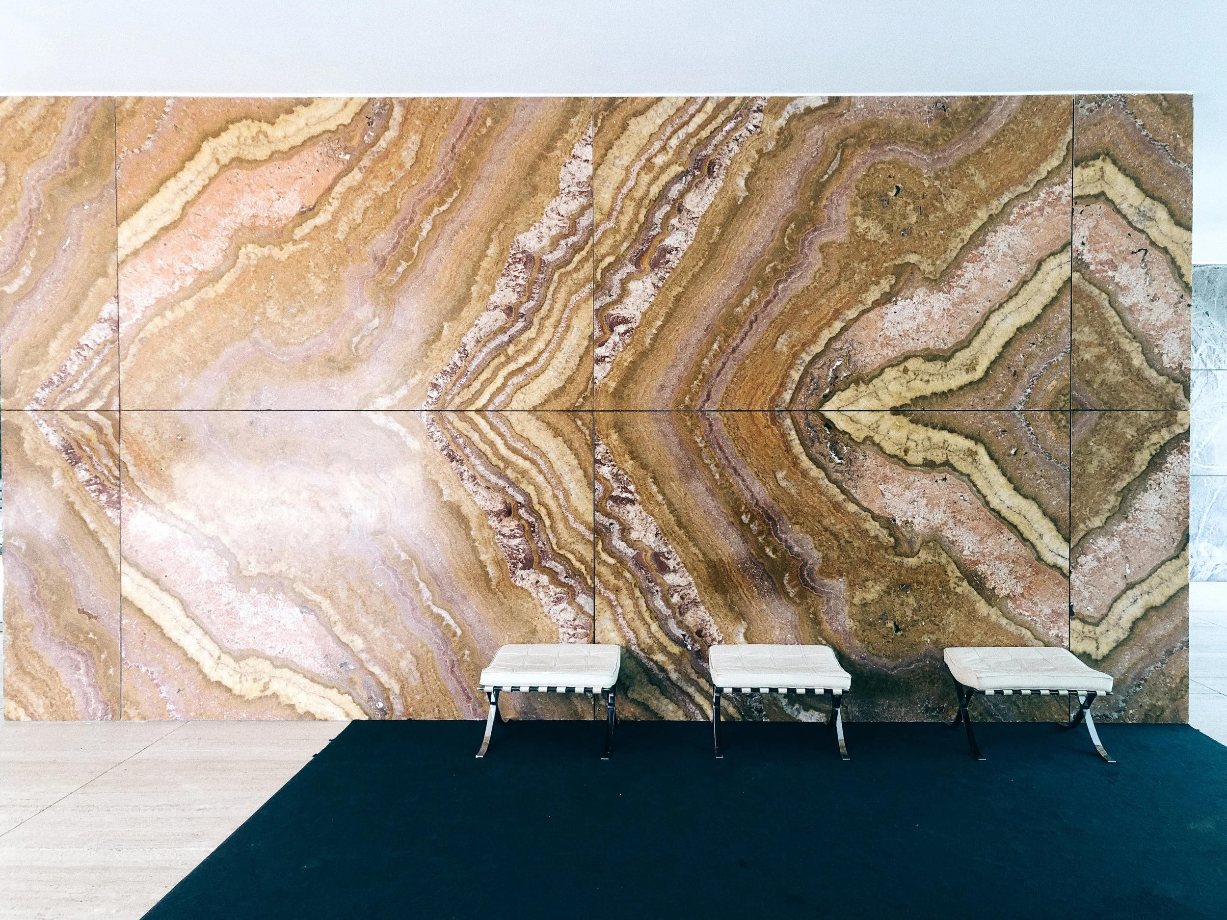 Book-matched marble—the use of two mirror-image marble slabs, set side by side on the same surface like the pages of an open book.